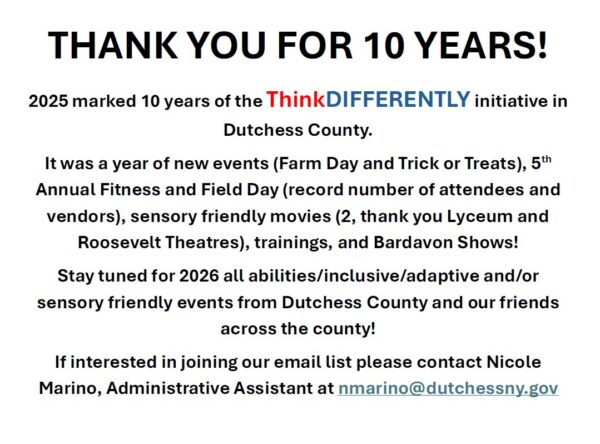Specific information regarding the ‘The Community’ calendar events can be obtained directly from that event’s organizer. Information on “ThinkDIFFERENTLY” events sponsored by Dutchess County Government’ can be obtained through our Contact Us form.